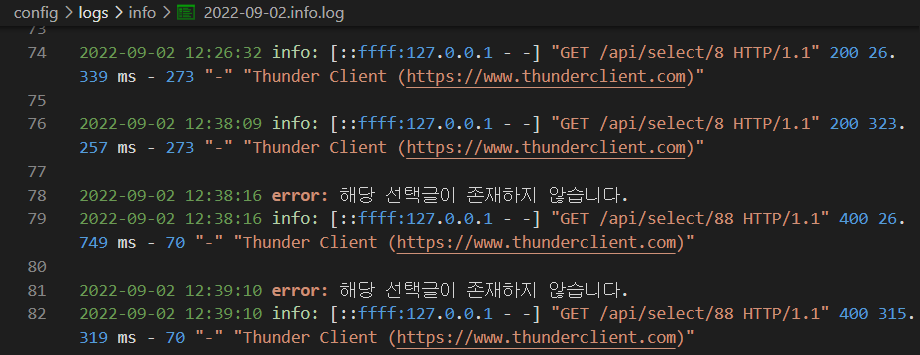 winston 단독으로 사용하면 각 api안에서 logger.info / logger.error를 사용해서 해당 api에 접근했을 때 로그를 기록한다.