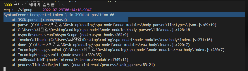그리고 오류 문구 중 at JSON.parse (<anonymous>) 라는 말을 찾아보니 json 형식에 문제가 있다고 해서 내가 친 코드만 열심히 뒤적거렸다.
