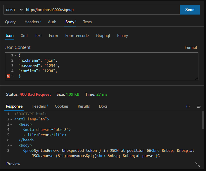 생성이나 수정을 하기 위해서 요청을 보내면 SyntaxError: Unexpected token } in JSON at position 67 같은 에러를 종종 만났다....