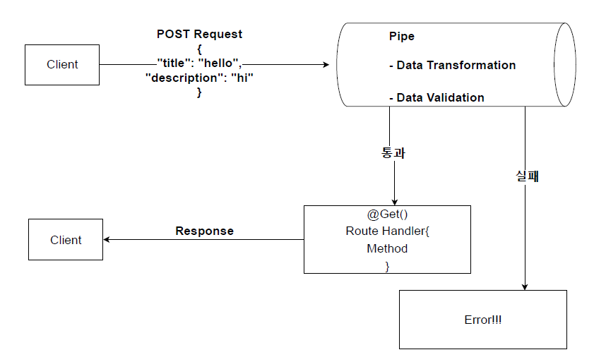 Nest는 메서드가 호출되기 직전에 파이프를 삽입하고 파이프는 메서드로 향하는 인수를 수신하고 이데 대해 작동함