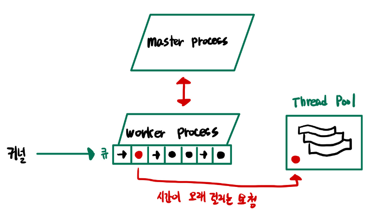 만약 큐에 담긴 요청이 오래 걸린다면, 스레드 풀을 만들어 이벤트를 위임하여 따로 수행하고, 워커 프로세스는 다른 이벤트를 처리함