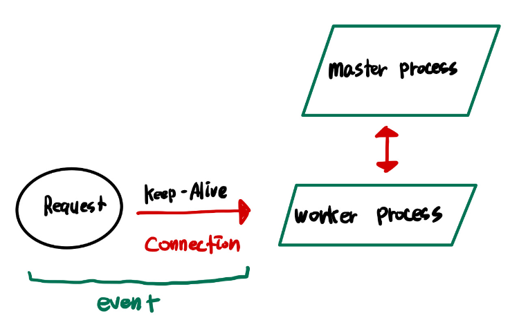워커 프로세스(Worker Process) : 실제로 일하는 곳, 워커 프로세스가 생성될 때 지정된 listen 소켓을 배정받고, 해당 소켓에 요청이 들어오면 커넥션을 형성하고 처리함