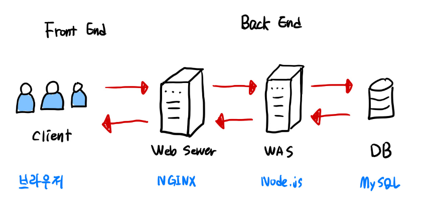 WAS(Web Application Server) : 클라이언트 요청에 대해 동적 처리가 이뤄진 후 응답. 비즈니스 로직, 데이터 처리를 하는 서버